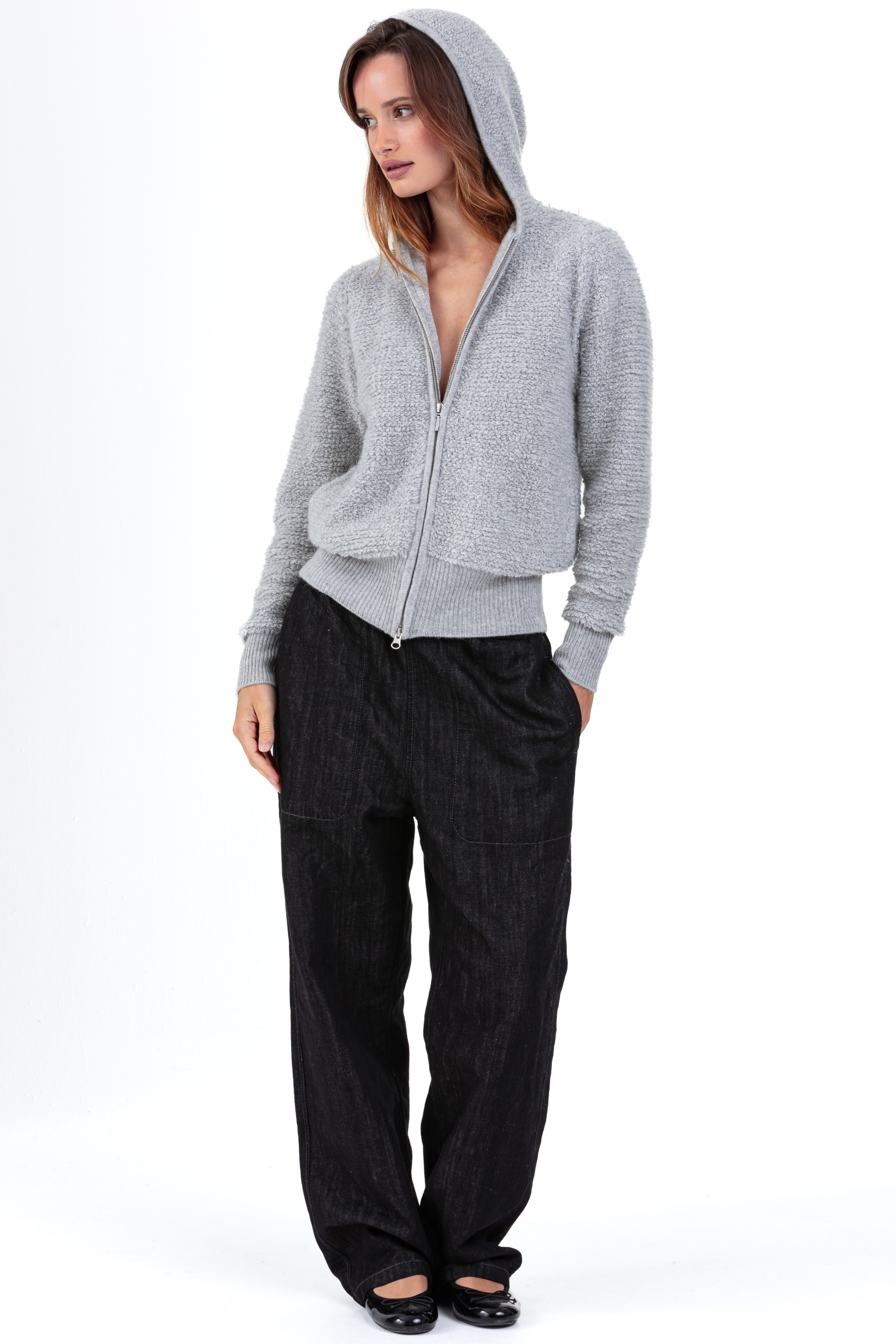 Die bequeme und moderne Damenstrickjacke PAVLOVA aus Kaschmir zeichnet sich durch ihre Bouclé-Struktur und ihren lässigen Stil aus. Sie besteht aus 100 % Kaschmir (4-fädig) und verfügt über einen Zweiwegereißverschluss und eine Kapuze für einen sportlich-schicken Look. Mit ihrem Gewicht von 480 g vereint sie Wärme und Leichtigkeit.