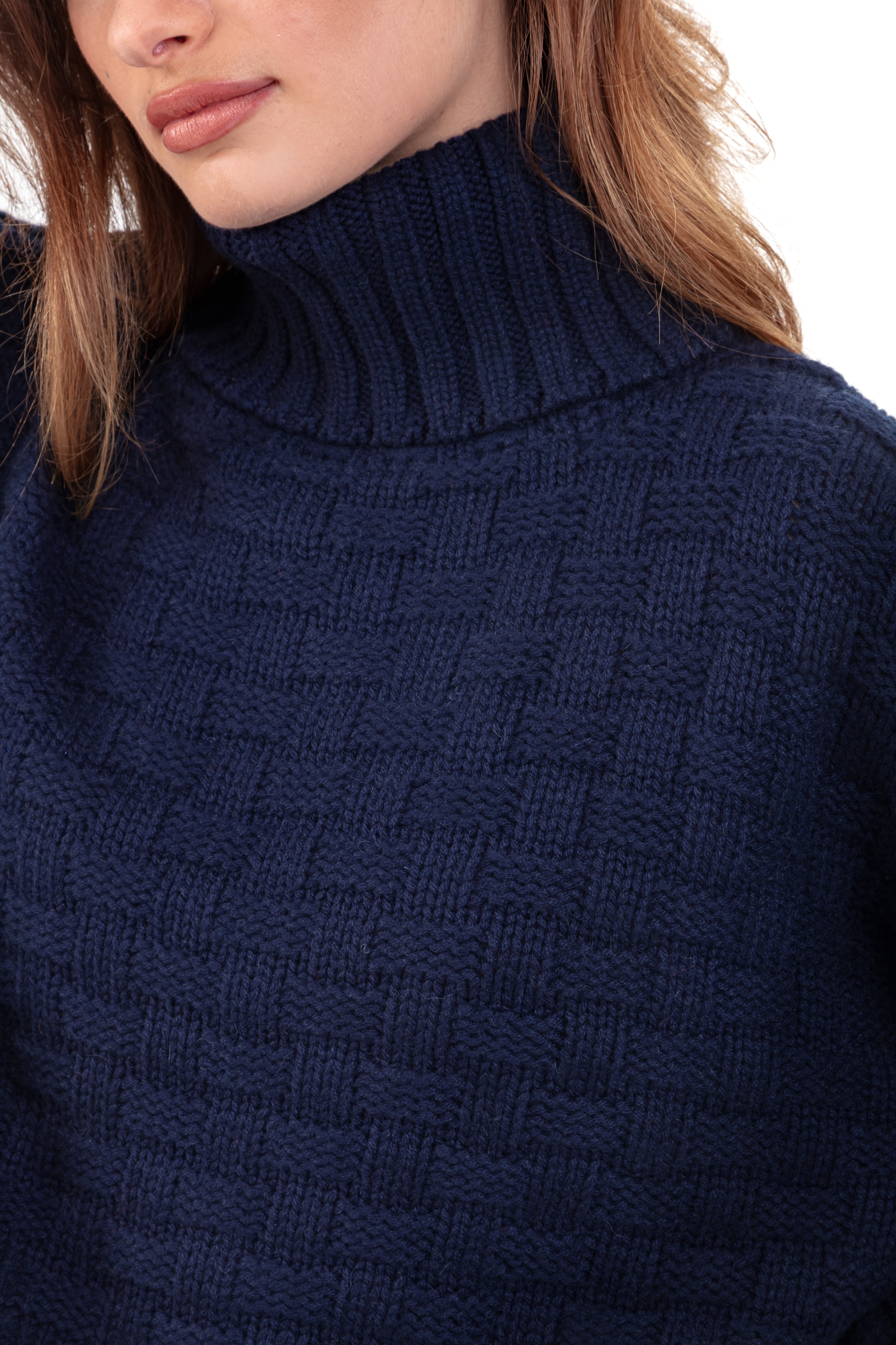 Sein gerippter Rollkragen und die langen Ärmel werden durch ein geometrisches Zopfmuster über die gesamte Oberfläche veredelt, das dem Modell eine grafische und zugleich anspruchsvolle Ausstrahlung verleiht.