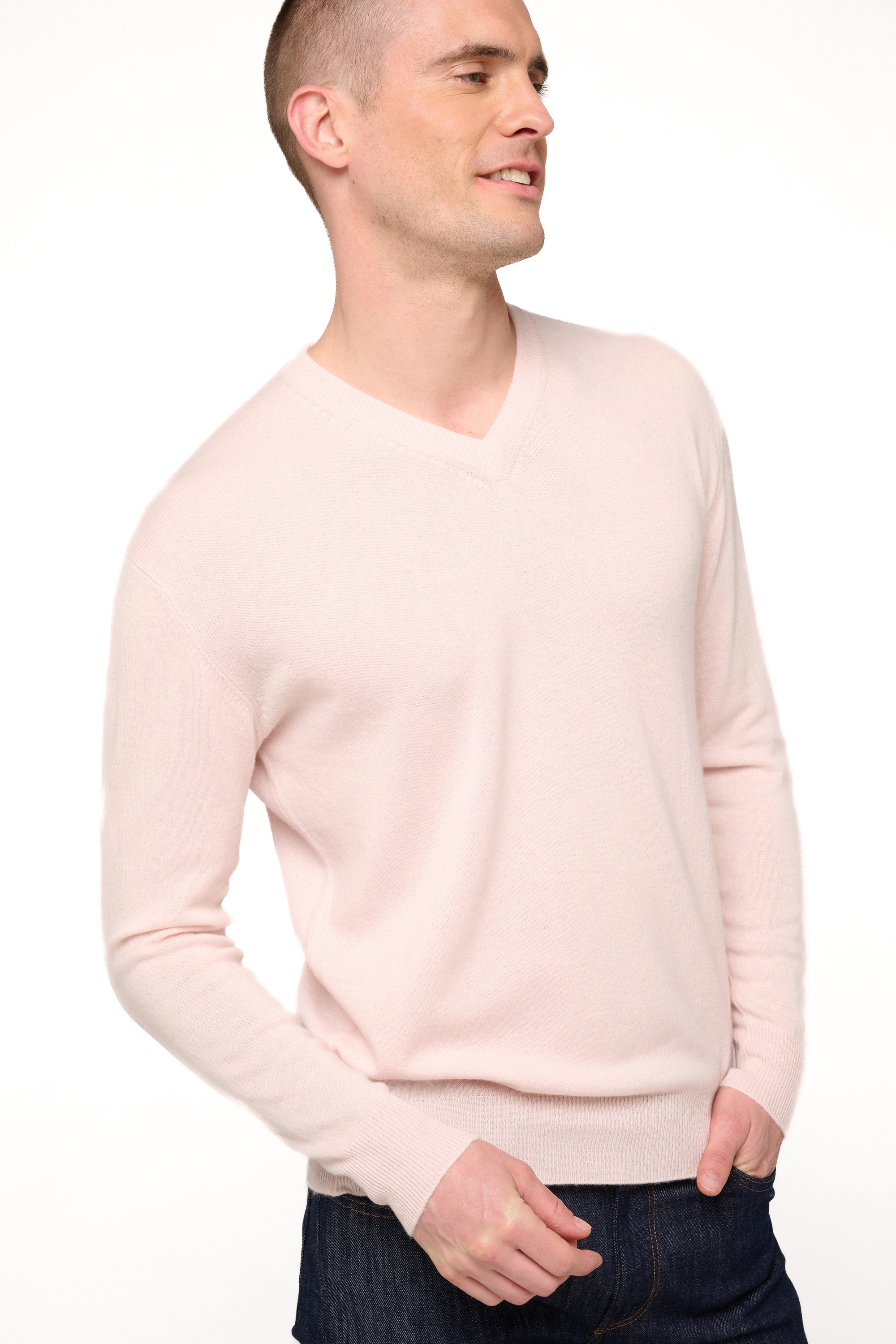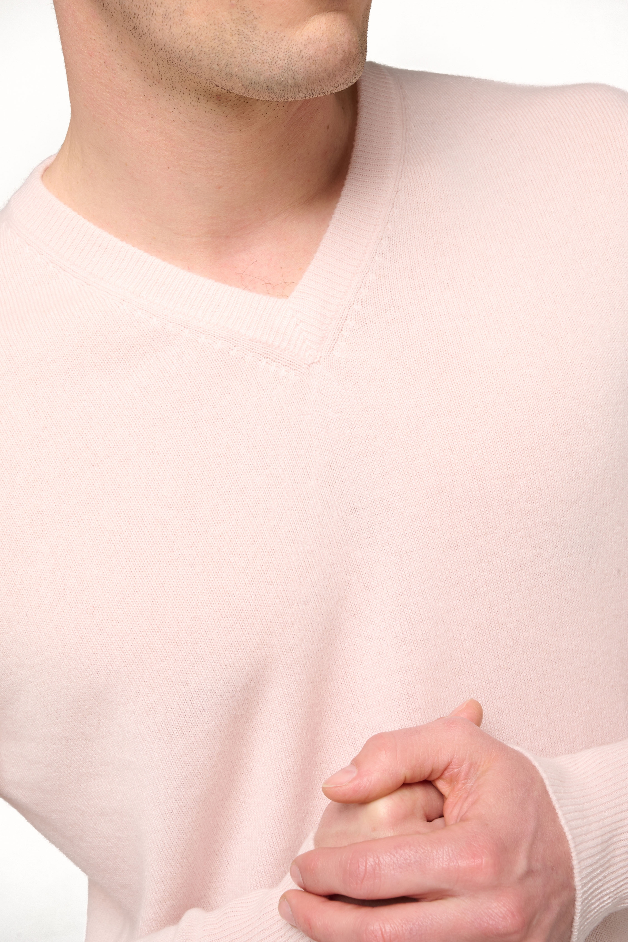 Feinmaschig (2-fädig) und extrem weich. Gerade geschnitten. Verarbeitung mit 7cm breitem Rippenbund und Ärmelbündchen. Fällt dadurch sehr schön. Etwas klassischer als sein kleiner Bruder taillierter V-Ausschnitt-Pullover (Gaspard) und genauso zeitlos. Kann sehr gut über einem Hemd oder einem T-Shirt getragen werden. Tragbar zu jeder Jahreszeit und zu jeder Gelegenheit. Bemerkung: der V-Ausschnitt streckt die Figur.