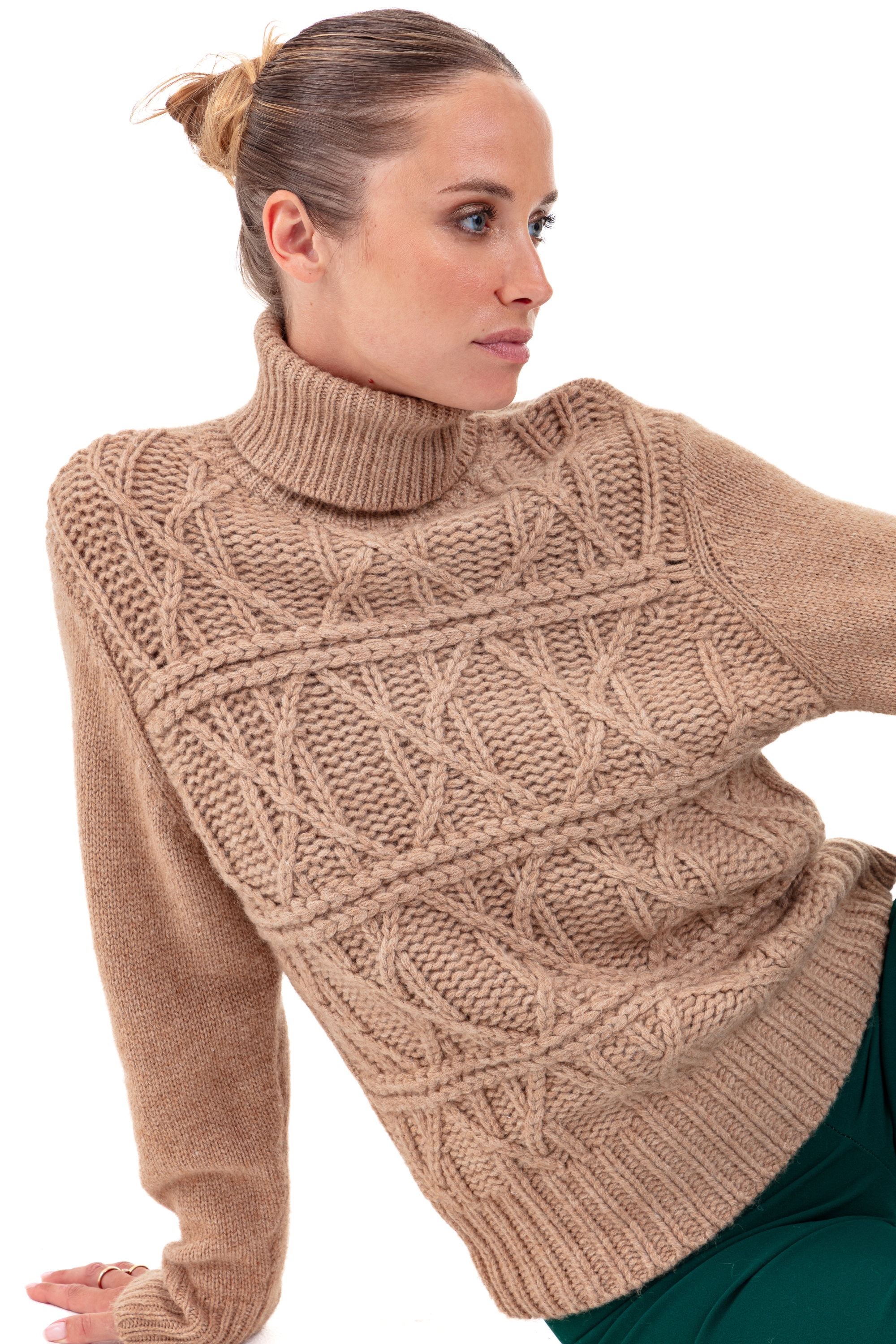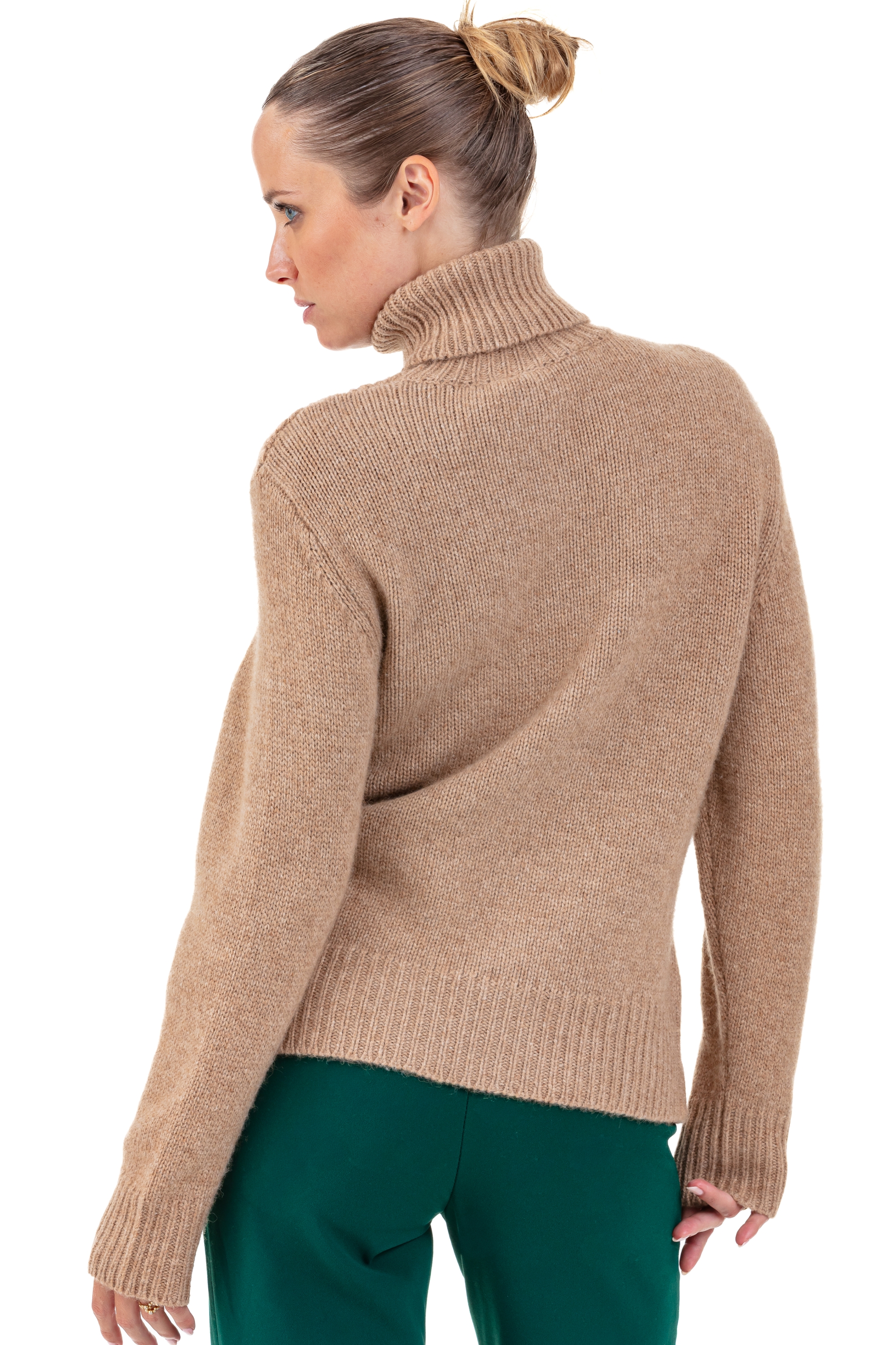 Der einzigartige und strukturierte Damenpullover POETI aus Kamelhaarwolle zeichnet sich durch sein grafisches Design aus. Er ist aus 100 % Kamelhaarwolle gestrickt und kombiniert einen 16-fädigen Zopfstrick auf der Vorderseite mit einem leichteren 6-fädigen Maschenbild auf der Rückseite, den Ärmeln und dem Rollkragen. Dieser Kontrast verleiht ihm einen architektonischen und modernen Stil.