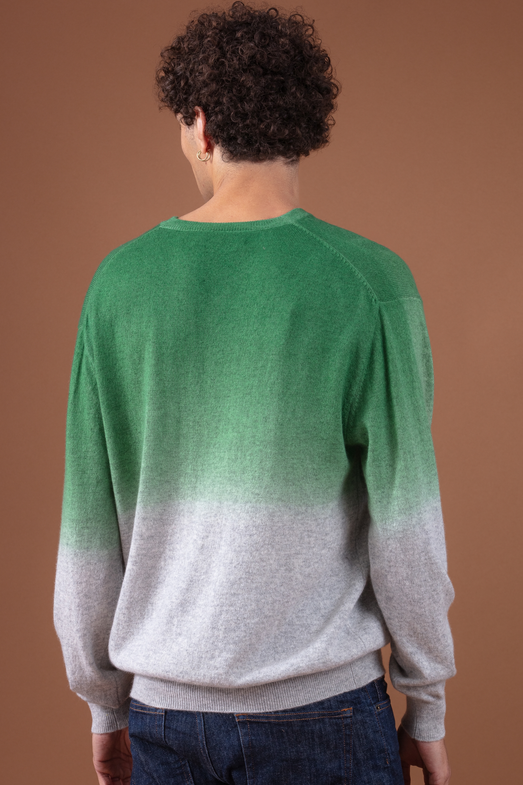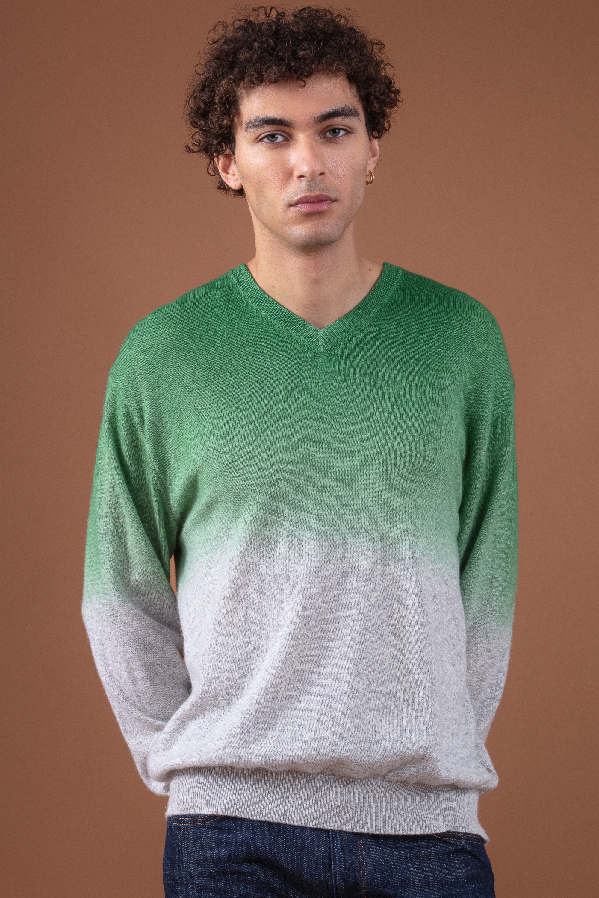 Pullover mit V-Ausschnitt und verlaufendem Print im Tie & Dye-Stil. Ein trendiger Cashmere-Pullover, den Sie ohne Einschränkung tragen können! Entdecken Sie unsere Farbversionen, die wir uns sorgfältig ausgedacht haben, um Ihnen originelle, aber leicht zu tragende Modelle anzubieten.