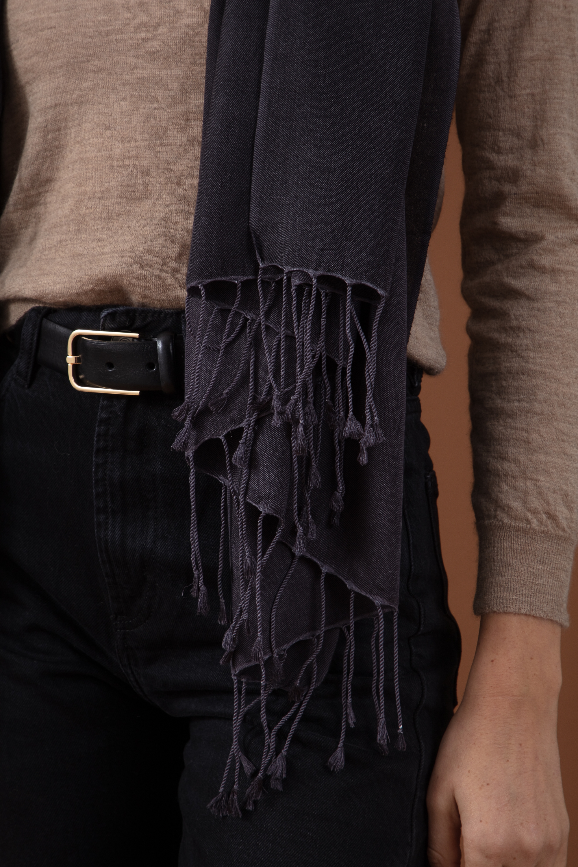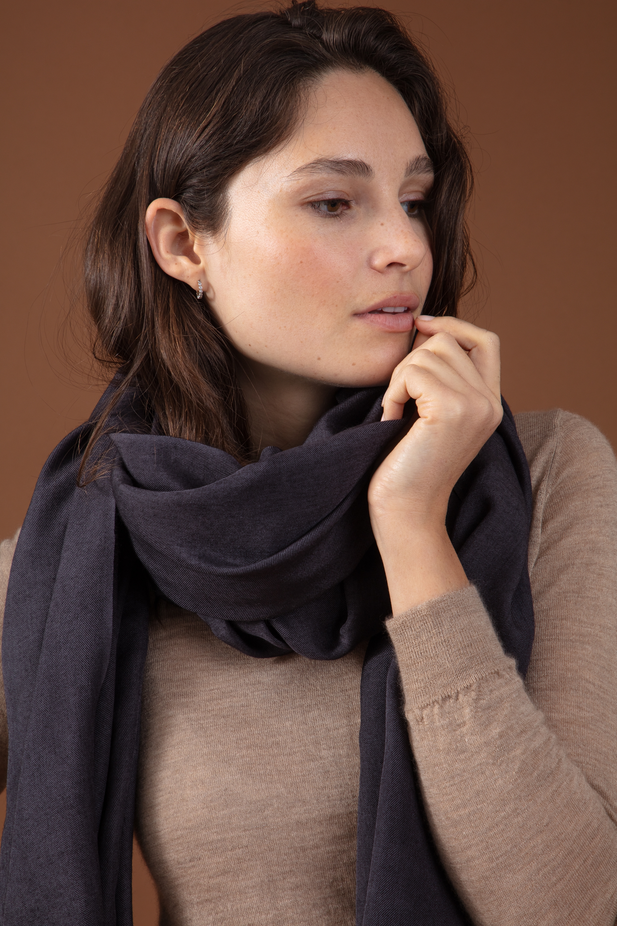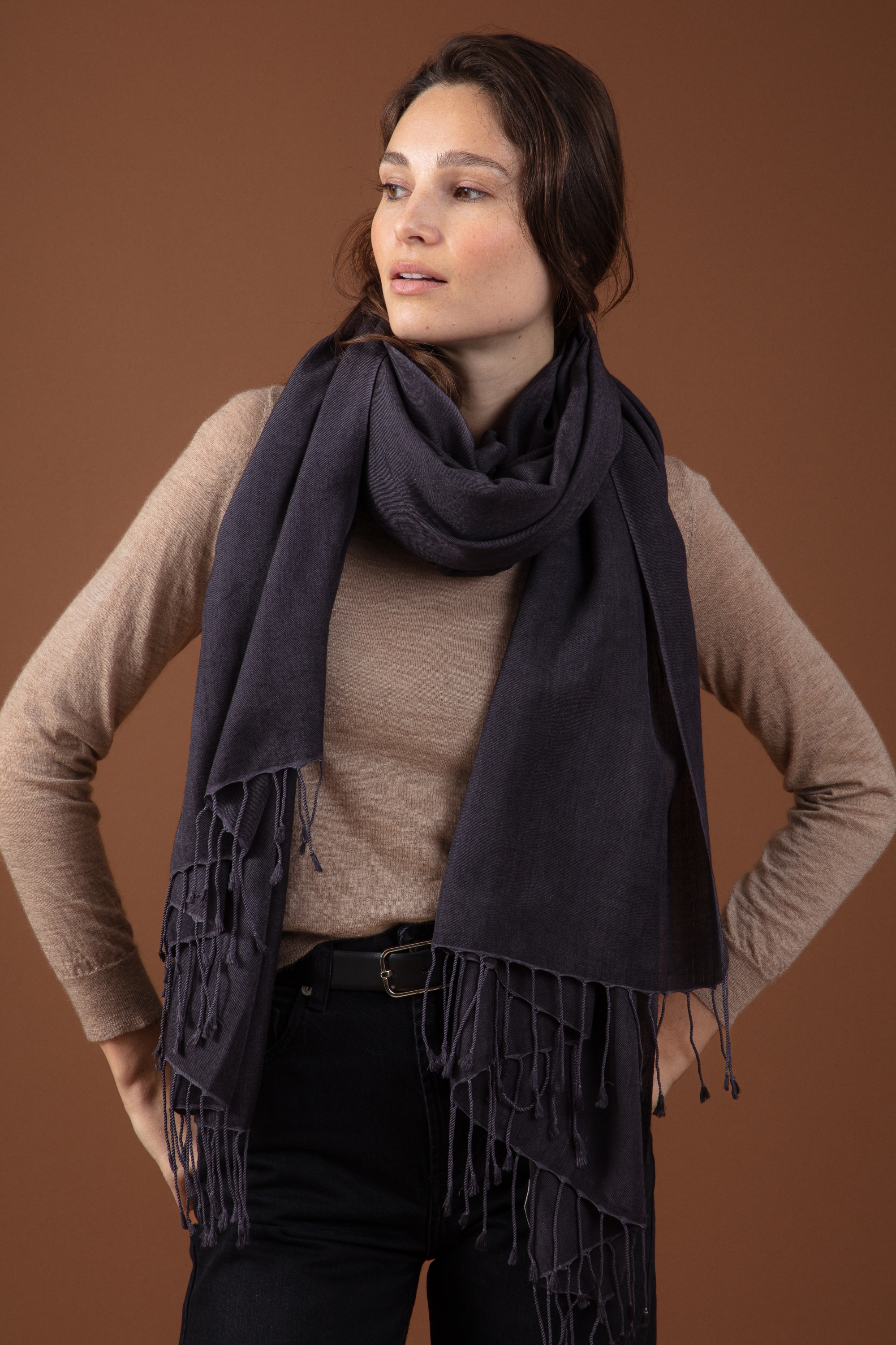 Diese große, gewebte Stola aus Cashmere und Seide wird Sie kuschelweich umhüllen. Handgeknüpfte, 10 cm lange Fransen. 280 x 100 cm.
